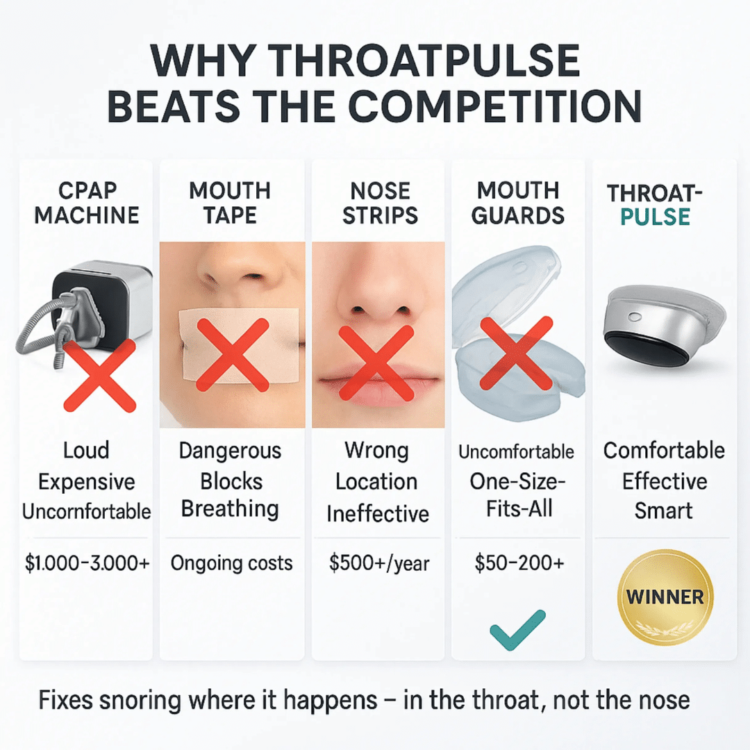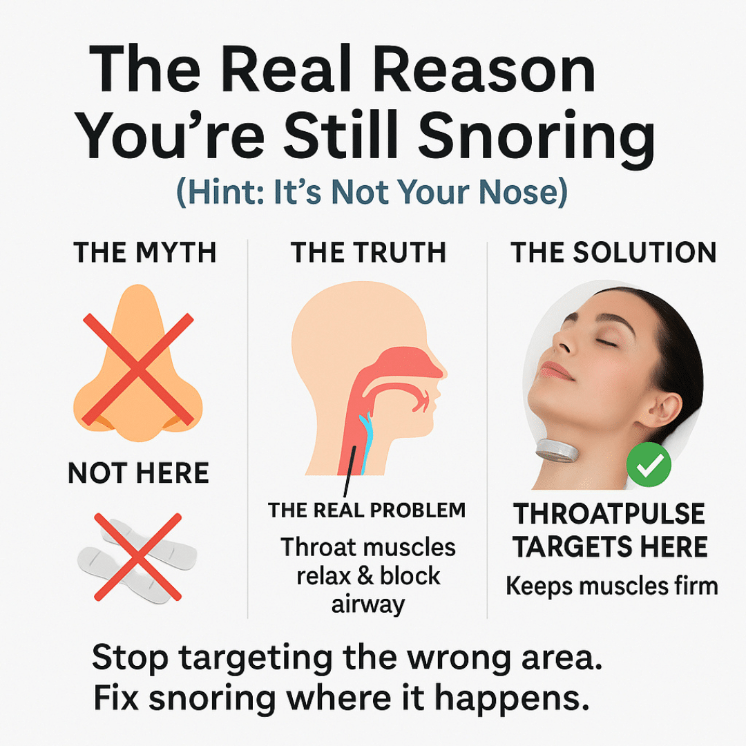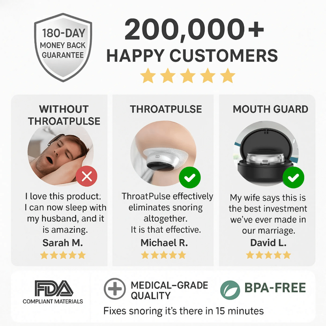 Transform your sleep—and your life—with the only anti-snoring device that finally fixes what’s actually broken. Experience peaceful nights and energized mornings with ThroatPulse™.